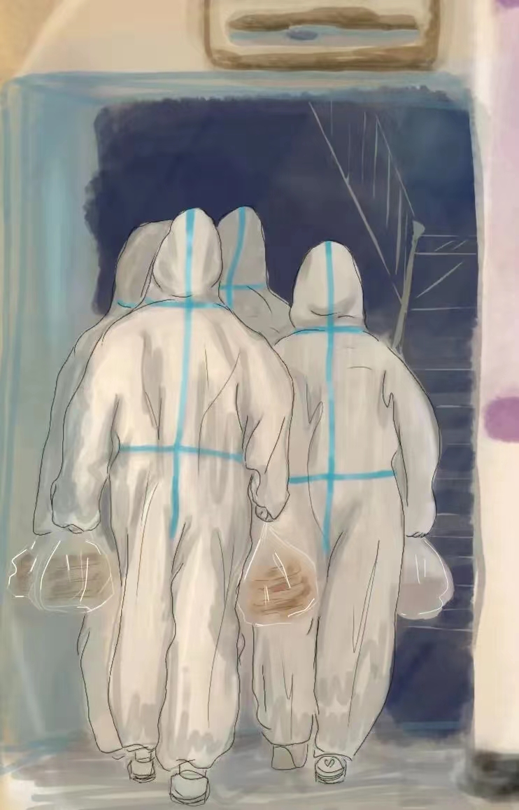 志愿者们身穿防护服变身“大白”,为同学们每天送饭、打水,他们奋力前进,总是冲锋在前,无怨无悔。沉重的物资,寒冷的天气,厚重的防护服,丝毫没有妨碍到他们紧张有序的工作。在这枯燥而有意义的服务中,他们满怀热爱,不辞辛苦为同学们服务。