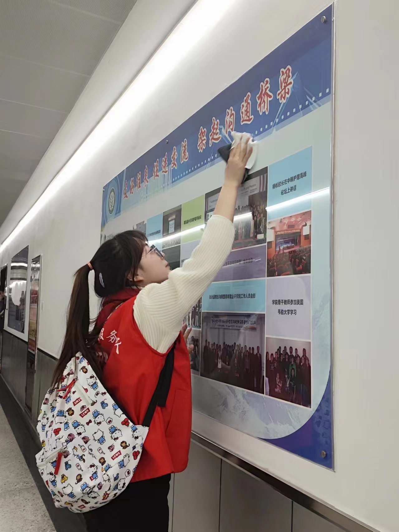 另一组志愿者们来到了护理学院楼进行卫生打扫,分工配合。志愿者们互相协作,分别擦拭座椅、窗台、储物柜、门窗、讲台、饮水机等区域,对物品进行整理,志愿者们清扫垃圾,拖洗地板,并对空间进行消毒。时时体现出扎实的作风,处处彰显了行动的力量。