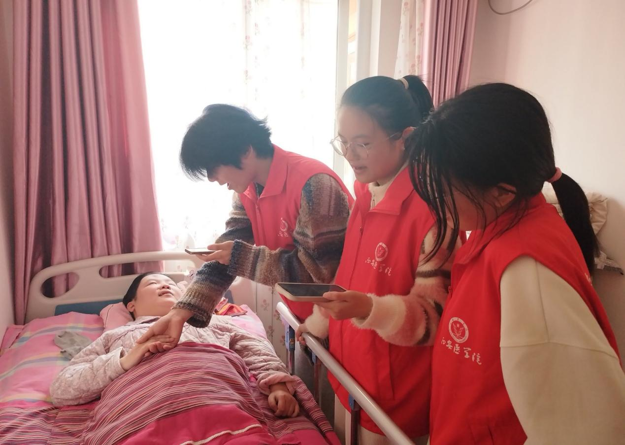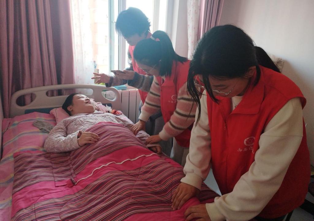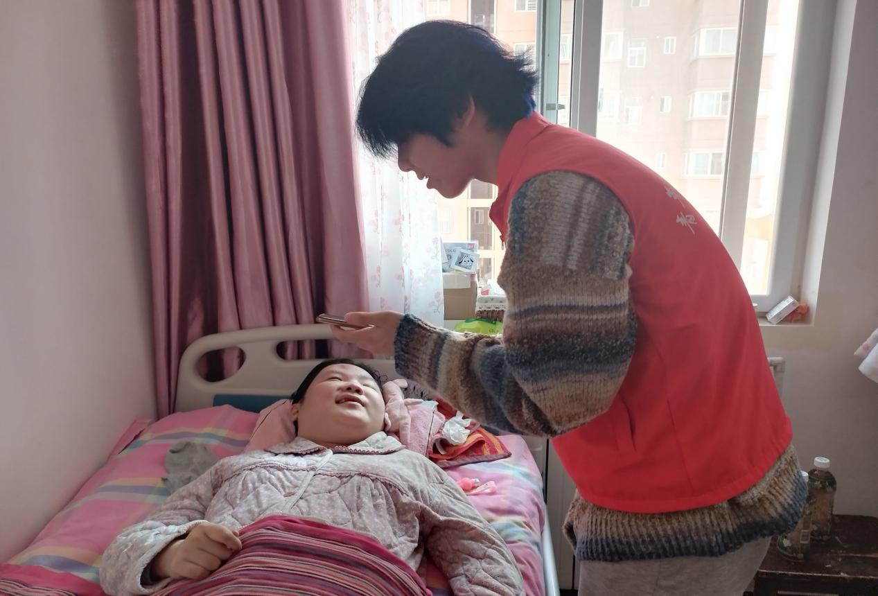 志愿者还给华楠姐姐唱歌,在唱歌的时候,华楠姐姐用手打着节拍,她笑容灿烂,并给志愿者点赞。同时,志愿者帮助姐姐训练口肌和手部力量,给姐姐按摩放松肌肉,和姐姐掰手腕,房间里充满着欢声笑语。在本次活动结束之际,华楠姐姐和志愿者们一起比心飞吻告别。
