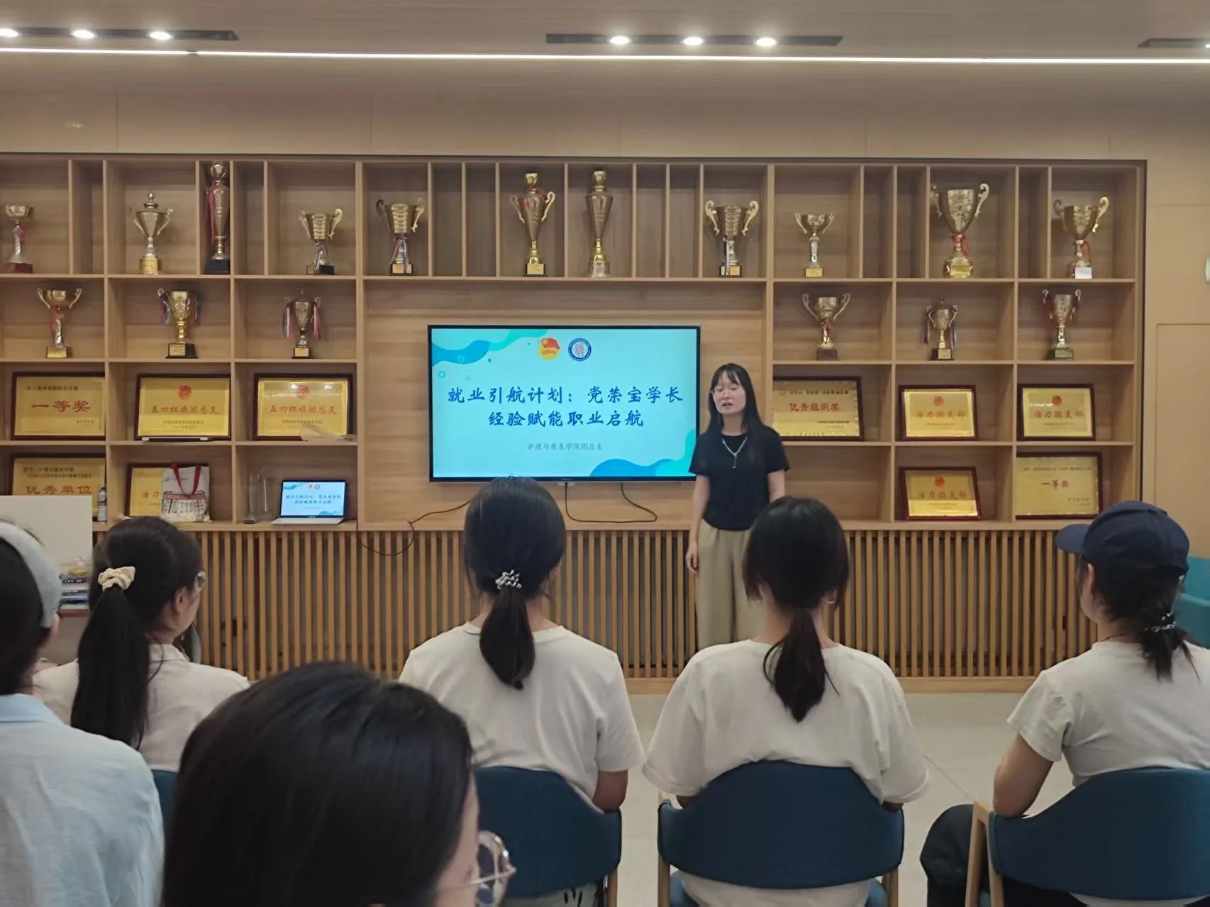 在经验分享环节,党荣宝学长围绕自身学习、求职实践与职业发展三大维度进行了深入细致的分享。他首先回顾了在校期间的学习规划,强调扎实专业知识与掌握实践技能的重要性。谈及求职关键环节,党荣宝结合自身经历,系统讲解了求职前的充分准备、简历制作技巧以及面试过程中的注意事项。在职业发展规划上,党荣宝深刻剖析了护理与康复行业的广阔前景与时代机遇,他建议同学们要根据自身兴趣和优势,制定长期与短期目标,保持积极进取的态度,在服务社会的实践中实现自我价值。