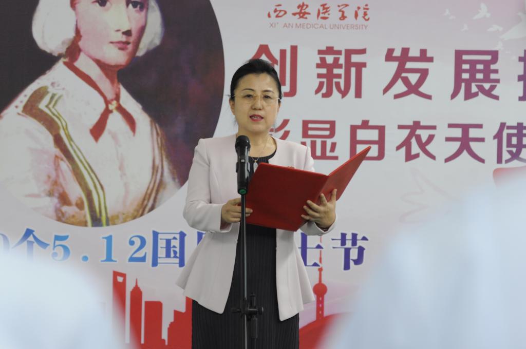 首先,校长杨帆通过视频向护理学院全体师生送上节日的祝福,他指出我校护理专业办学历史悠久,具有雄厚的师资力量,是陕西省唯一的护理学重点学科,多年来,在学科带头人张永爱教授的带领下,在学科建设、科学研究、人才培养及国际化建设等方面取得了长足发展,并形成了一套特色的护理教育理念,先后获批“应用型护理人才培养模式创新实验区”、“护理专业综合改革试点项目”、 “护理学省级实验教学示范中心”等15项陕西省普通高等学校本科教育教学工程项目。2020年护理专业又成功获批国家级“一流专业”建设点。最后,他强调,自开办护理教育以来,护理学院已为社会培养出3万余名优秀的护理人才,不仅成长为西北五省乃至全国卫生健康战线的主力军,而且在医院医疗工作中具有举足轻重的地位。希望护理学院本着“大爱无疆,尚德精术”的要求继续为社会培养出更多更优秀的护理人才。