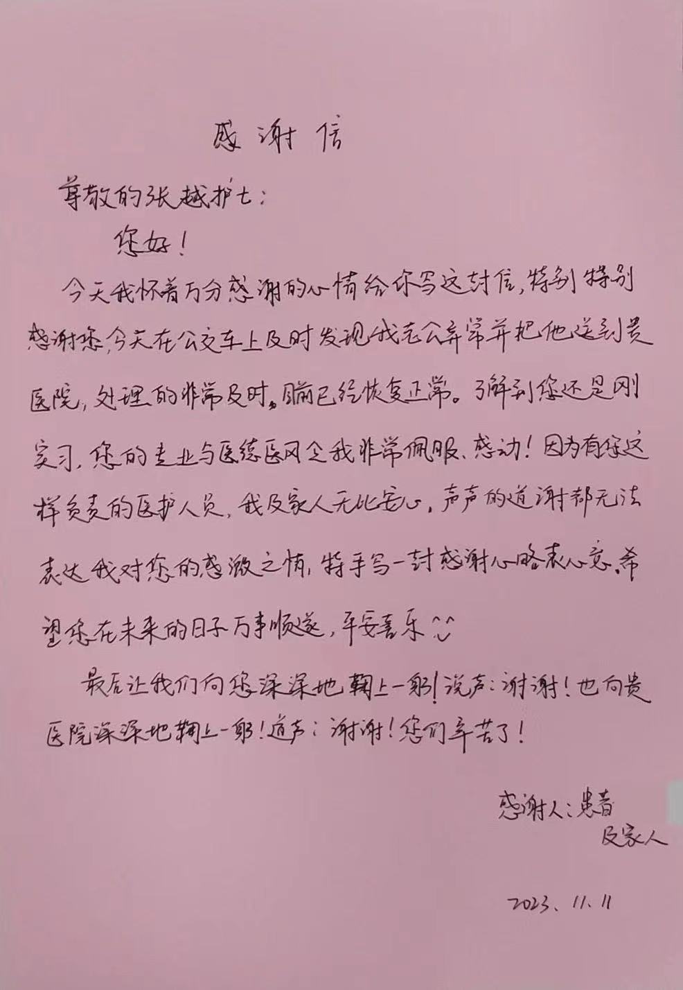 事后,患者家属向张越送来了感谢信。张越同学的事迹被学校第一附属医院官网、西安发布等媒体报道。