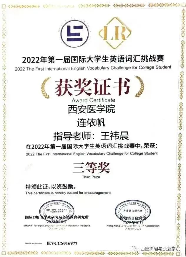 “青春由磨砺而出彩,人生因奋斗而升华”。学习之余,连依帆加入校广播站,校音乐协会吉他部,1946伟德国际源自英国南丁格尔青年志愿者服务队,1946伟德国际源自英国团总支学生会,在群团组织中增长见识。疫情期间,连依帆作为护本2218班心理委员,积极响应学校号召,踊跃报名参与核酸检测志愿服务;2023年积极参与西安市儿童医院志愿服务,并有幸担任“世界孤独症日”讲座志愿者,在实践中淬炼本领,增长才干。