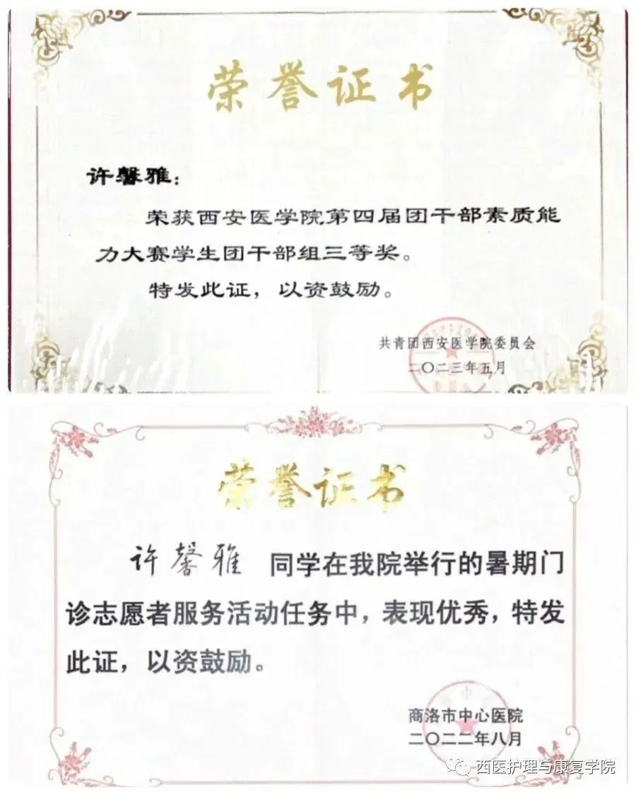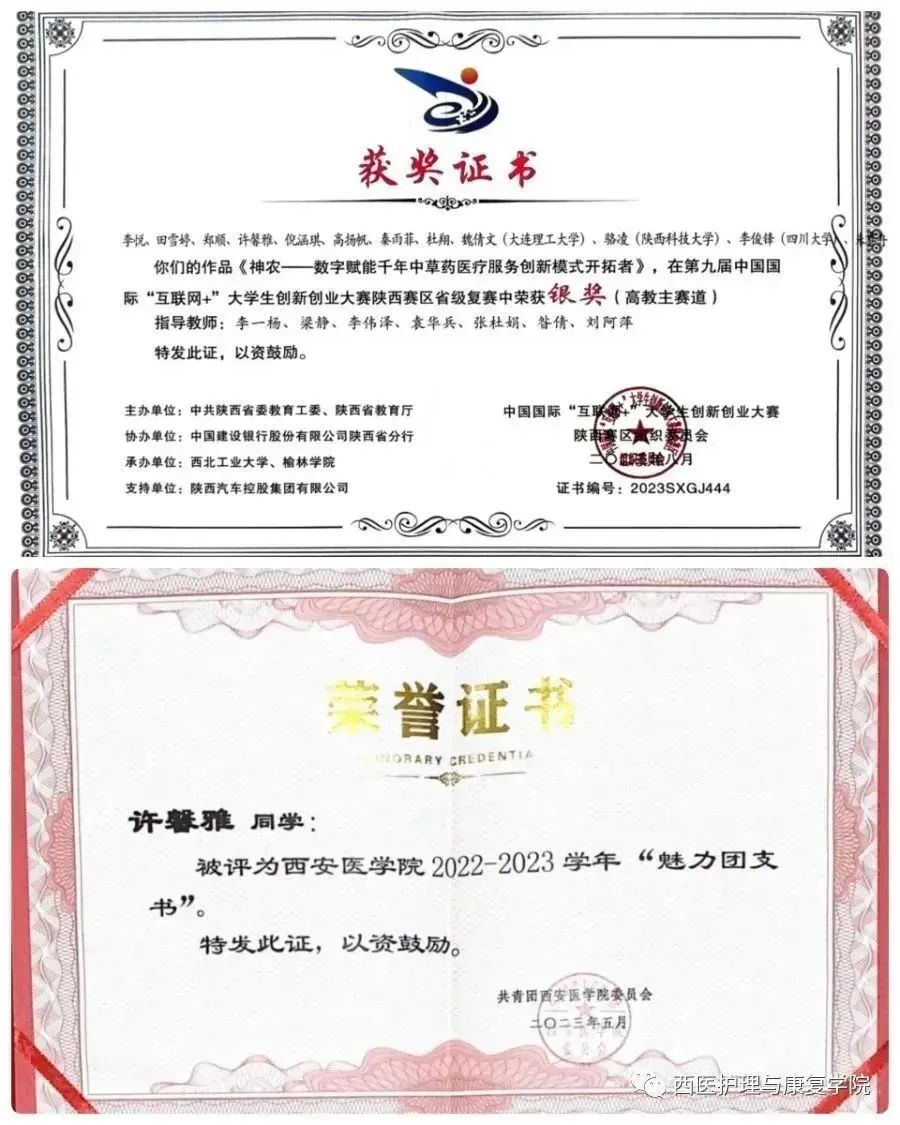 征途正未有穷期,不待扬鞭自奋蹄。许馨雅在担任学校广播站站长、大学生事务服务中心负责人以及班级团支部书记期间,尽职尽责,全力以赴,荣获2022学年魅力团支书,连续两年获得活力团支部;学习上严格要求,刻苦努力,荣获2022年国家励志奖学金,并在第四届团干部素质能力大赛中荣获校级三等奖,荣获第九届国际互联网+大学生创新创业大赛省级银奖,参与大学生创新创业项目并获批立项国家级大创项目1项;积极参与社会实践,参与商洛市中心医院的志愿工作。