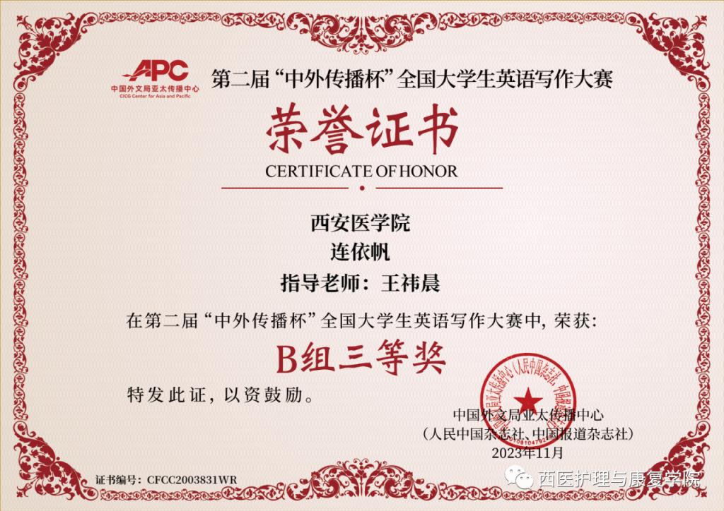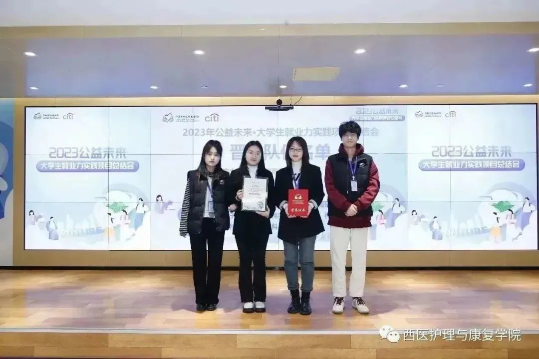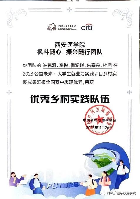 2023年11月,护本2103班许馨雅团队的“枫斗随心 振兴随行”项目,经过校内层层选拔,脱颖而出,并代表学校赴北京参加“2023年公益未来·大学生就业力实践项目总结会”,荣获“优秀乡村实践队伍”。该项目依托陕西省西安市长安区石砭峪新村资源优势,锚定新农村产业发展趋向,解决当前农民迫切需求,群策群力打造新型创新创业平台。许馨雅团队依托项目,扩大线上销售渠道,帮助村民建立抖音电商平台,依靠专业知识帮助农民提高健康意识,促进形成文明和谐的乡村新面貌。