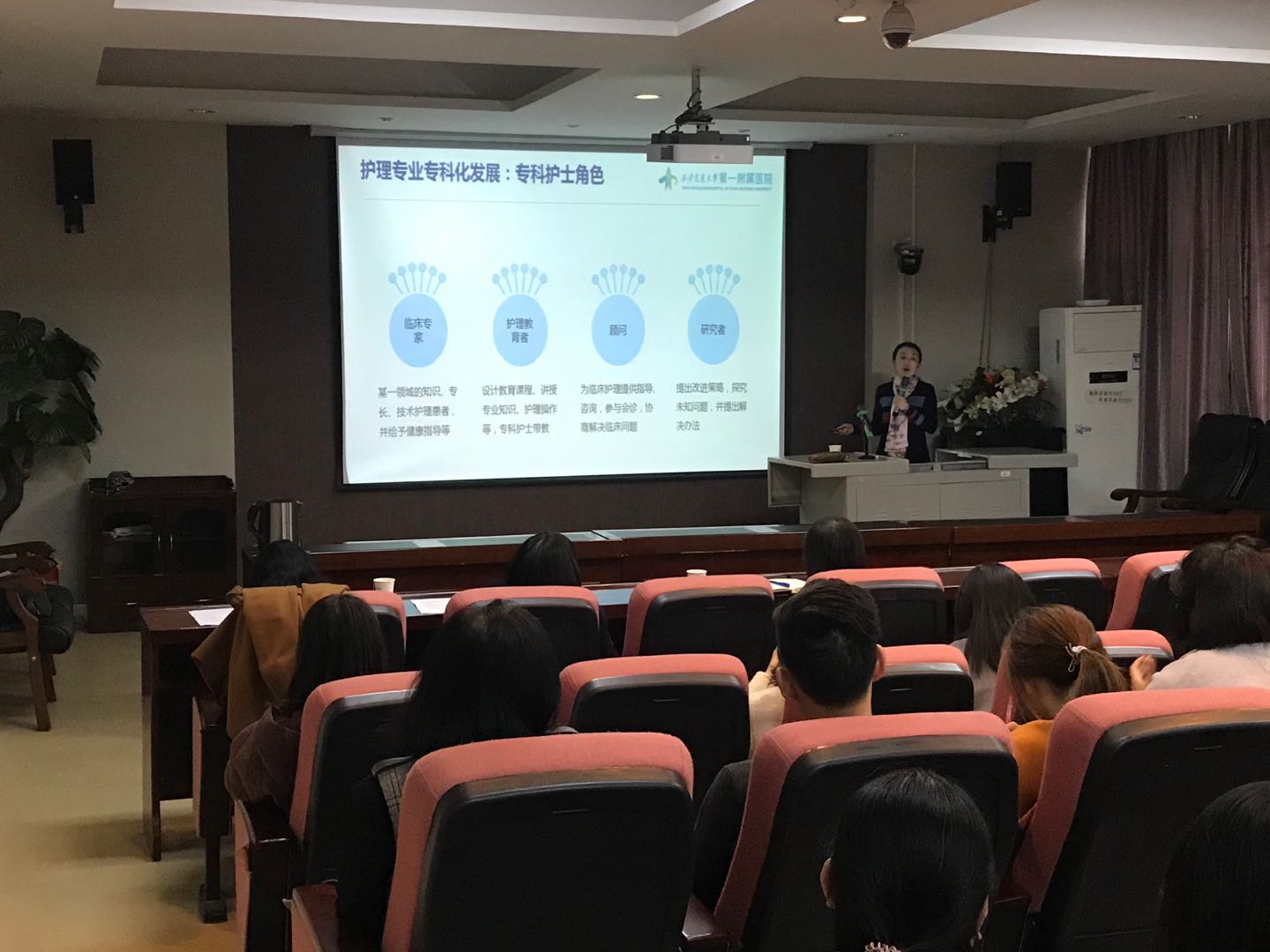 在本次讲座中,辛爱利老师介绍了西安交通大学第一附属医院医疗、护理、教学、科研现状及发展历程,通过丰富的图片和真实的案例深入讲解了护理专业专科护士、临床护理管理、护理质量控制、护理考核四个方面的进展,和我校师生共同分享了最新临床护理风险评估资料,并结合临床护理教学实践对我院护理教学提出了诚恳的建议。最后,辛爱利老师耐心地回答了师生们针对临床护理实践提出的问题,周小兰副院长做了精辟的总结,希望我院加强与西安交通大学第一附属医院的教研合作,使护理实践教学质量进一步提高。