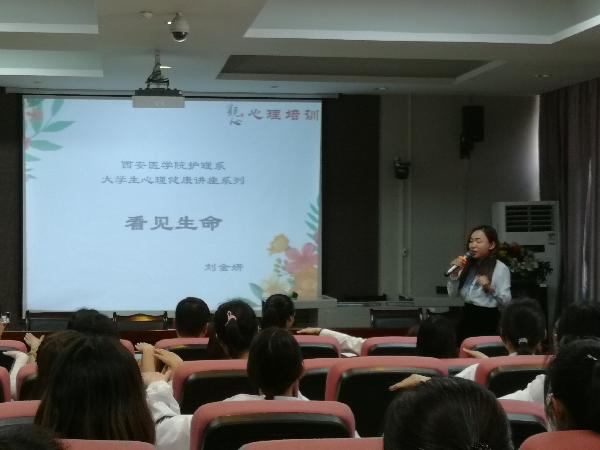 为了引导学生关注生命个体,学会悦纳自我,提升大学生心理健康教育工作的针对性和实效性,4月25日中午,护理学院特邀请陕西观心心理培训中心讲师、国家二级心理咨询师刘金妍老师在学院报告厅作了题为“看见生命,关注自我”的讲座。护理学院学生科张红梅、全体辅导员、各班心理委员以及部分学生代表参加了本次讲座。