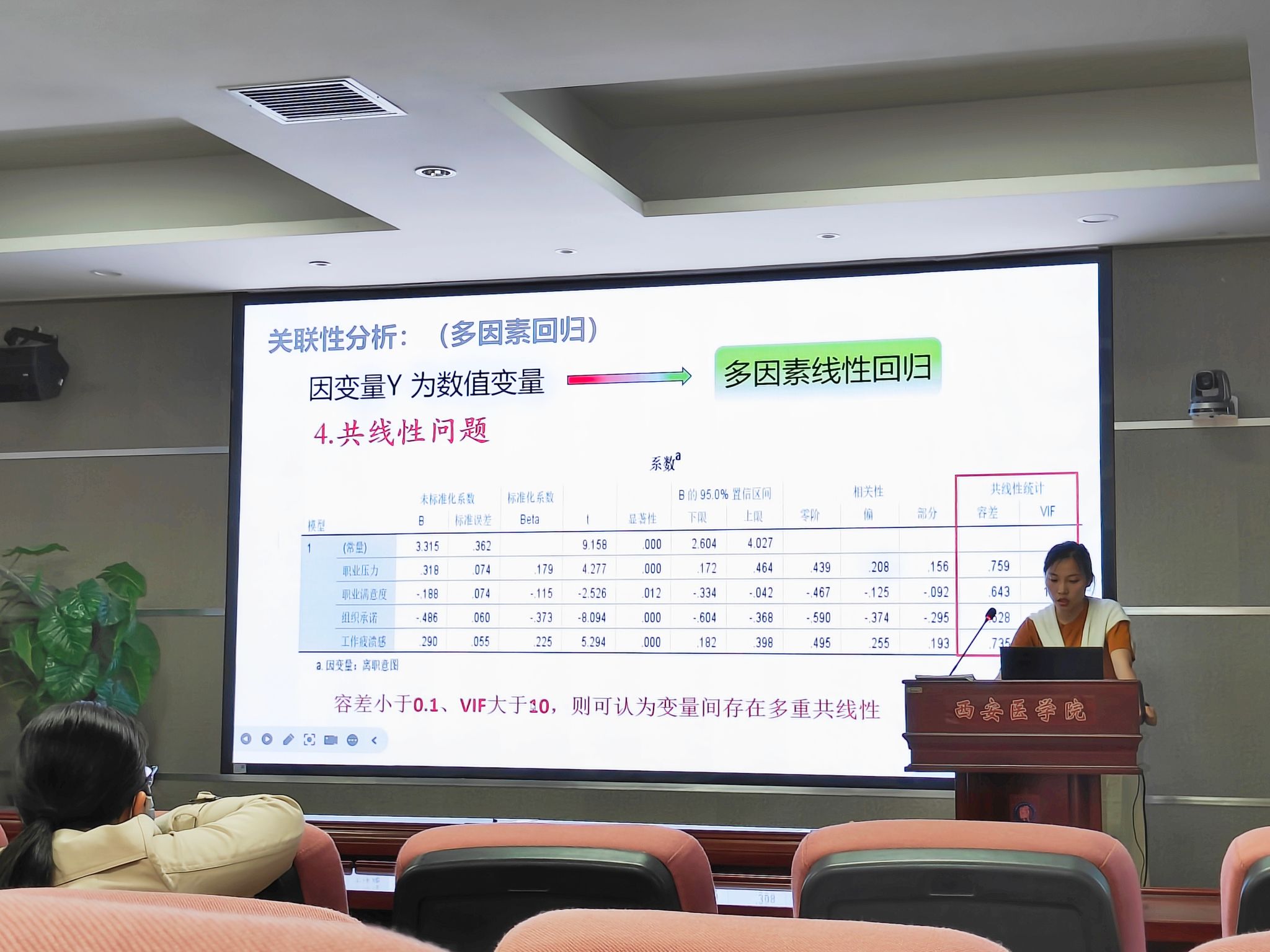 张晓娜博士以《常用统计分析方法在护理科研中的应用》为主题,从常用统计分析方法框架、各类常用统计分析方法的正确应用、样本量估算的问题等方面展开讲座,重点介绍了统计推断中差异性分析和关联性分析相关统计方法的分析步骤,对统计分析中的常见问题进行强调,并与现场老师进行了热烈讨论和深入交流。