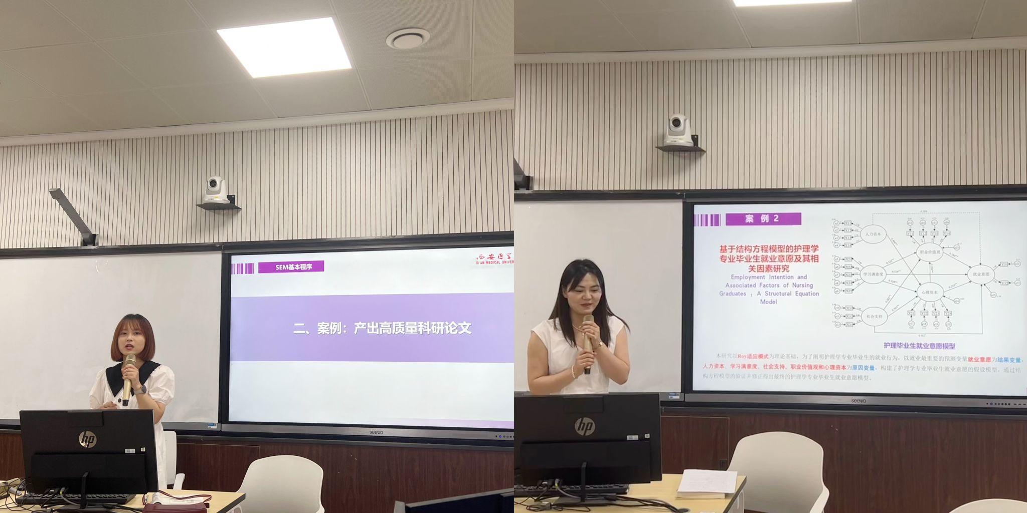 陈瑾沛、张新敏两名研究生分别就结构方程模型的应用实例及其在AMOS软件中的操作流程进行了分享。她们在张永爱的指导下,依托伟德国际1946bv“三秦学者”创新团队——母婴护理创新团队,利用结构方程模型进行相关研究的结果均发表于Journal of Nursing Management期刊(SCI/SSCI1区)。她们结合论文投稿经验深入讲解了在科研实践中运用结构方程模型构建理论框架、挑选测量变量、选择恰当测量工具等研究步骤,最终对收集的数据进行验证、筛选,并在模型中进行适用性检验和数据分析。随后,她们现场演示了结构方程模型的实际操作过程,逐步进行清晰演示,完整呈现了操作过程。