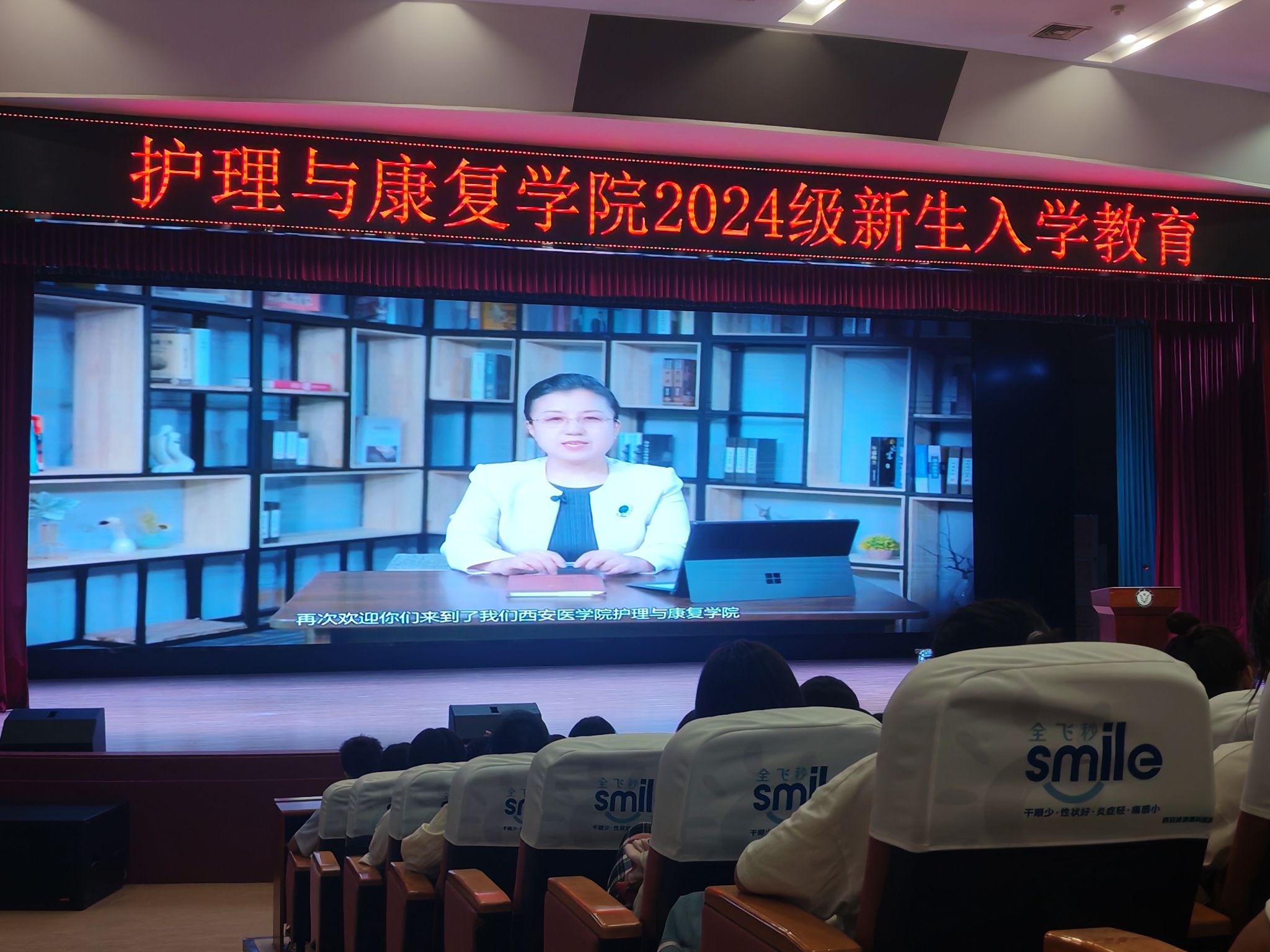 会议伊始,全体新生观看了学院宣传片,宣传片从四个篇章向新生介绍了伟德国际1946bv及护理学专业的历史与发展概况。随后,入学典礼在院长张永爱和党总支书记刘庆的视频致辞中推向高潮。张永爱对全体新生表示热烈的欢迎,并简要介绍了学院情况、专业历史沿革、人才培养目标和学院的教学及科研成果,同时,从四个方面寄语新生:要树立家国情怀、要常怀感恩之心、要坚定理想信念、要不断追求卓越。刘庆向全体新生介绍了我院学生管理工作,嘱咐学生不要蹉跎大学四年的美好时光,并提出四个希望:一是尽快调整心态,适应新环境,二是抱定宗旨、砥砺德行、敬爱师友,三是诚实守信,言行相符,四是用“奋斗”描绘人生画卷。